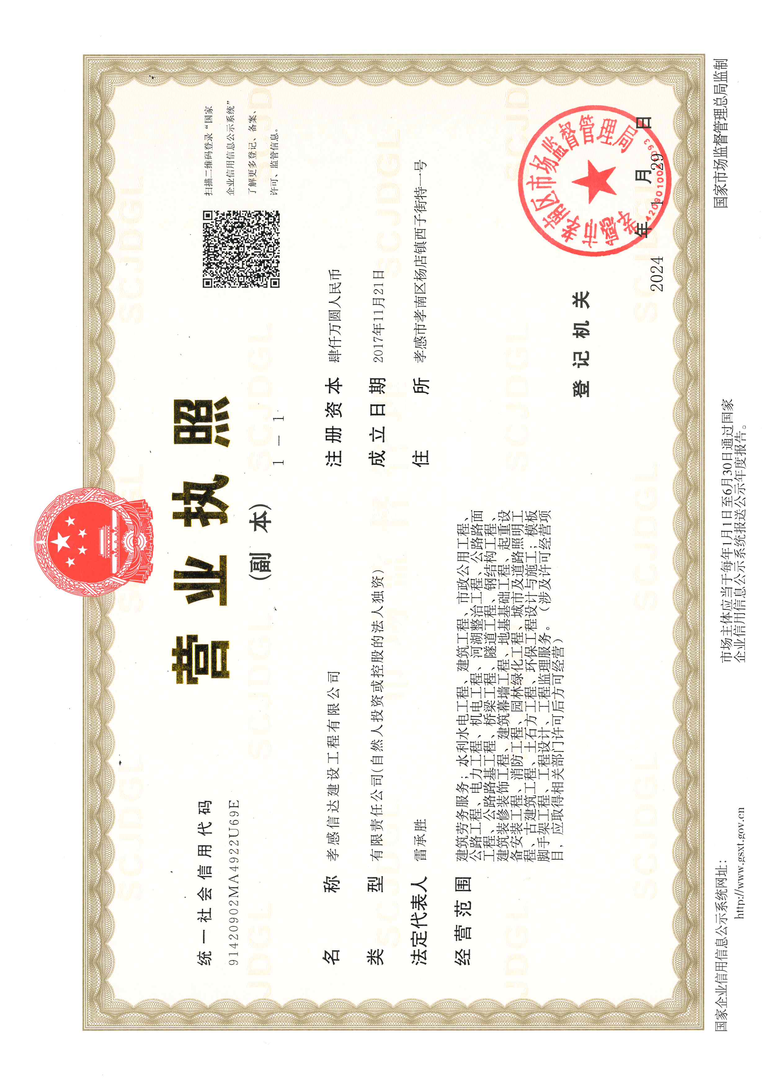 孝感信達建設(shè)工程有限公司成立于2017年11月21日,地址:孝感市孝南區(qū)楊店鎮(zhèn)西子街特一號,注冊資金4000萬元,有限責任公司(自然人投資或控股)。